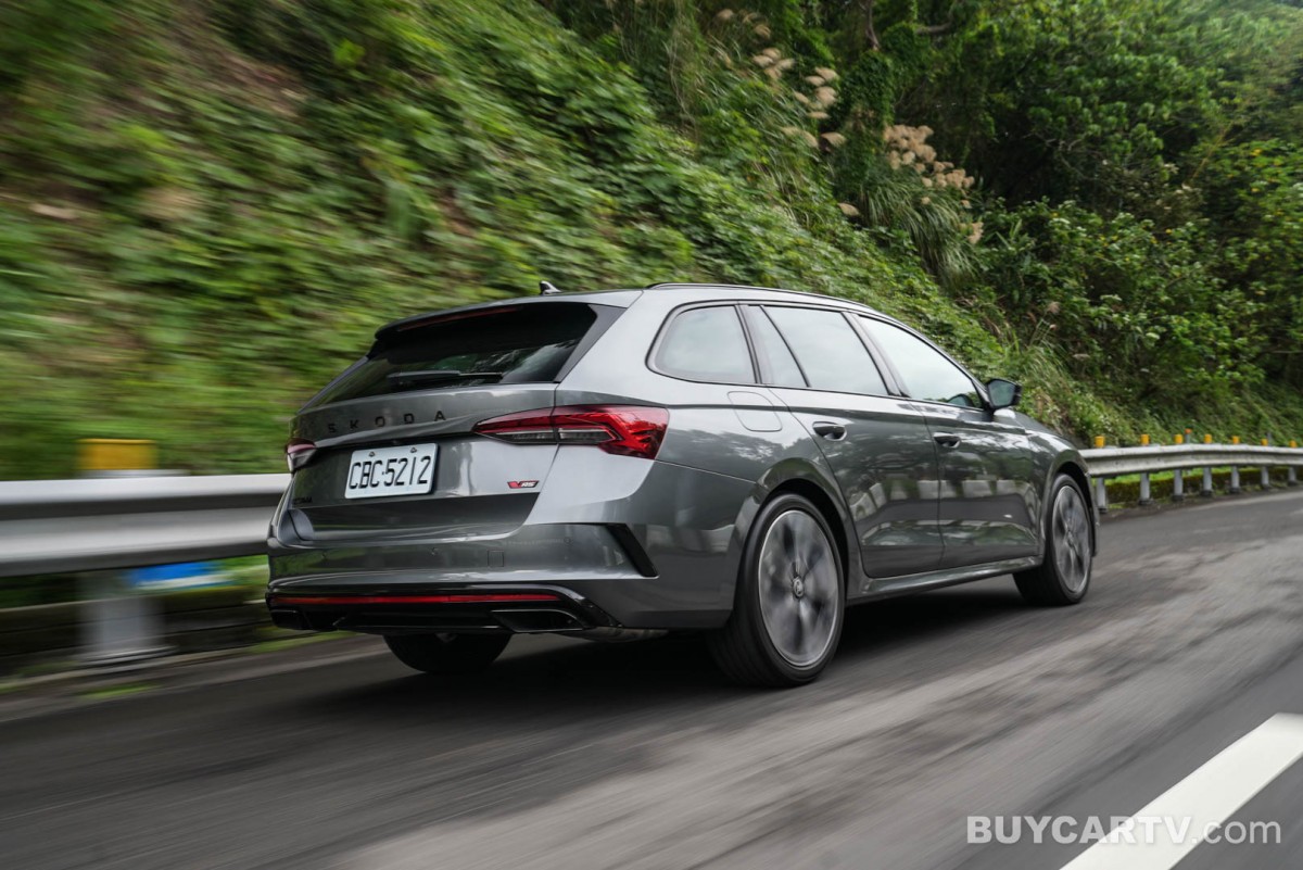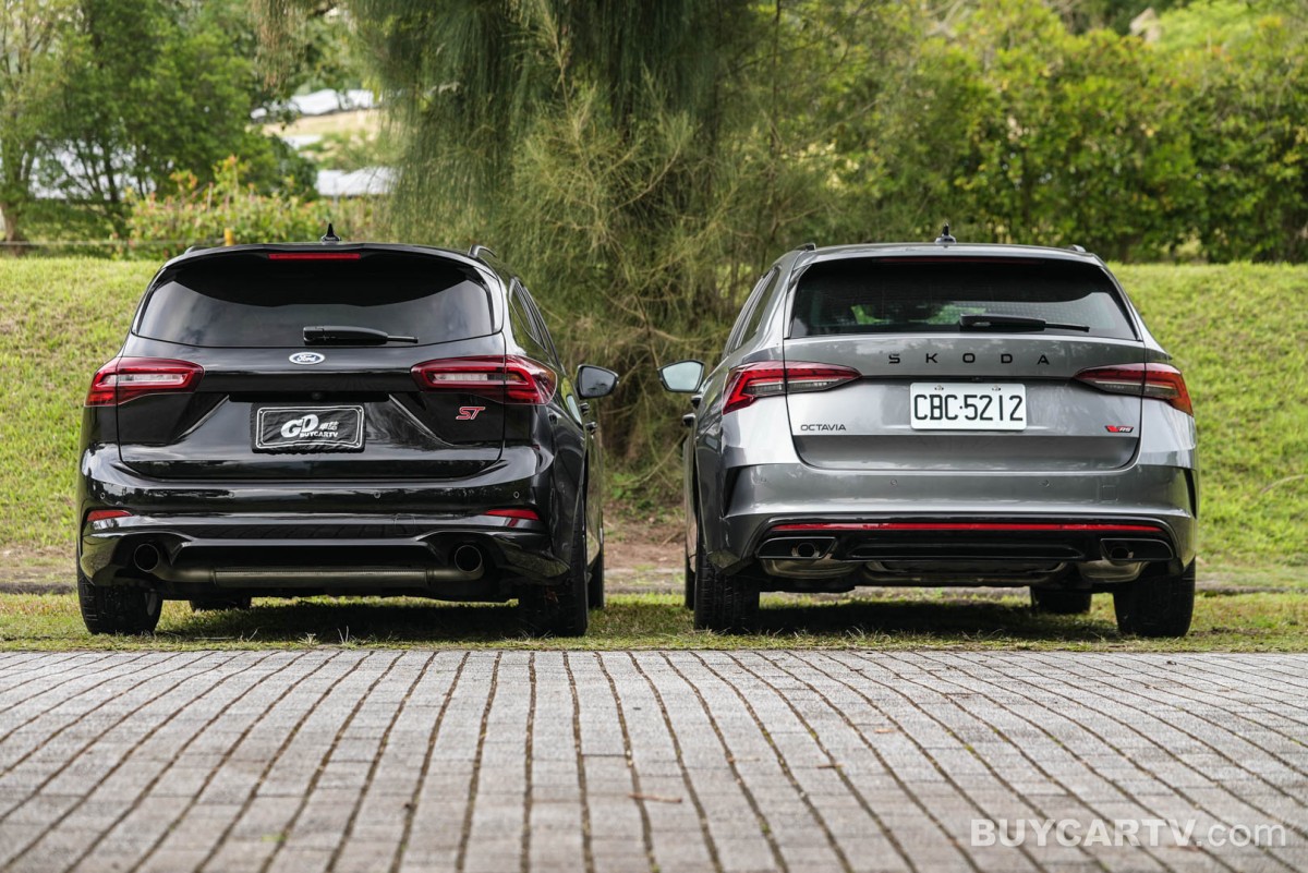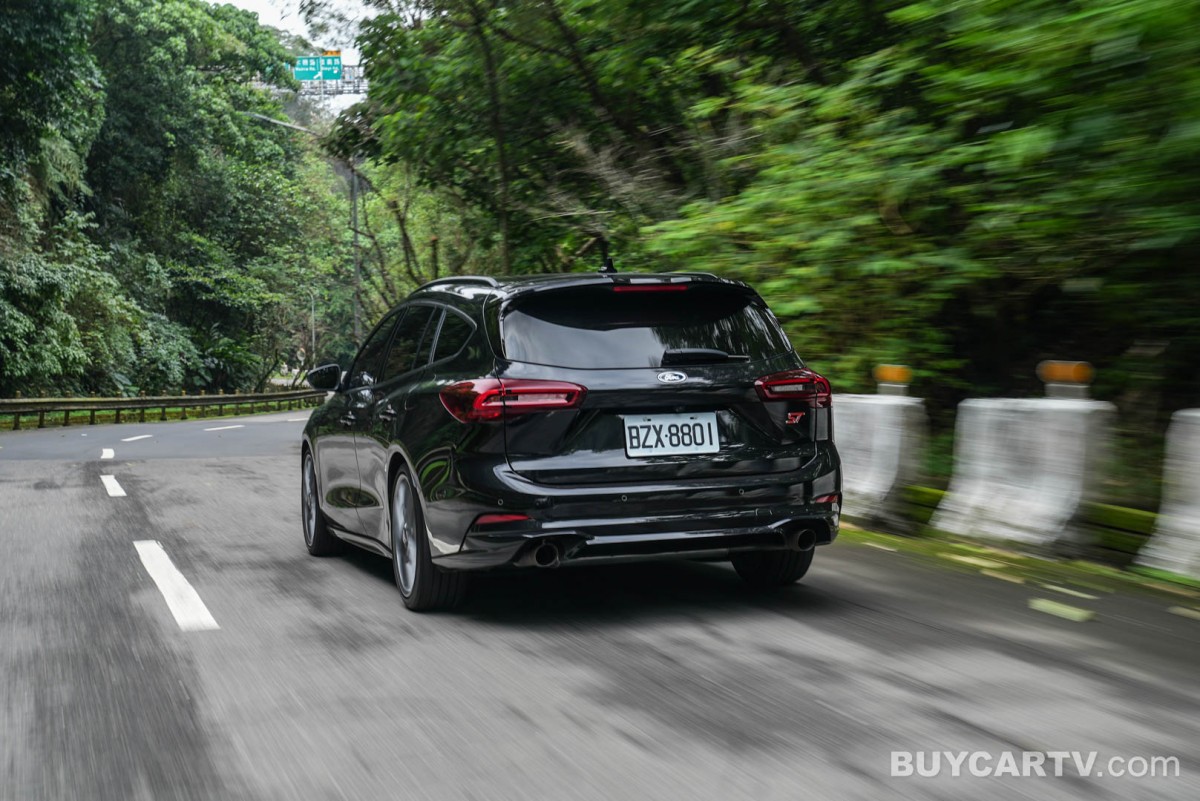 車側透過修長的旅行車身比例,展現兼具優雅與運動感的線條,搭配大尺寸鋁合金輪圈與紅色煞車卡鉗,強調性能化身份。車尾則以雙出排氣配置與運動化下擾流設計,呼應 ST 車型的性能定位,同時維持整體造型的成熟與低調。