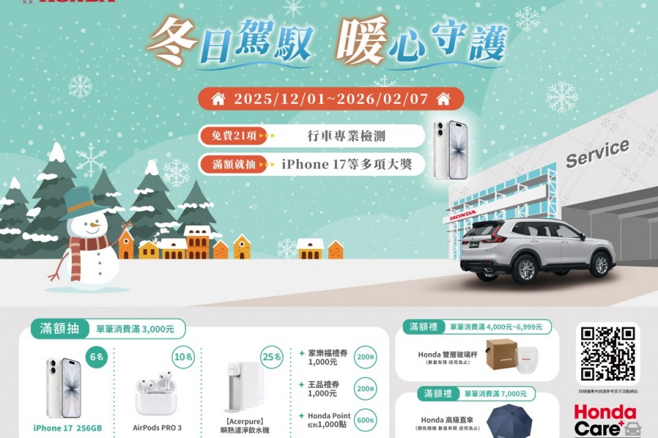 Honda Care +「冬日駕馭 暖心守護」活動開跑 回廠消費滿額抽iPhone 17等多項好禮 免費21項行車安全健檢與多項冬季優惠同步登場