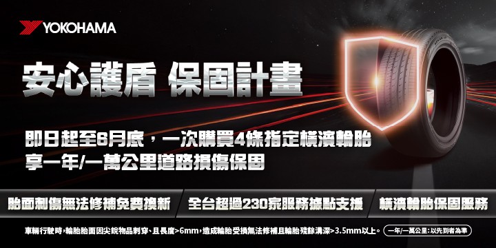 2026 年1月1日至2026年6月30日止,車主於全台TOYOTA 服務據點一次購買4 條指定橫濱輪胎(性能胎(AD09)、越野胎(G016、G018)花紋不含在內),即可享有最長一年或10,000 公里內(以先到者為準)的道路損傷免費換胎保障。