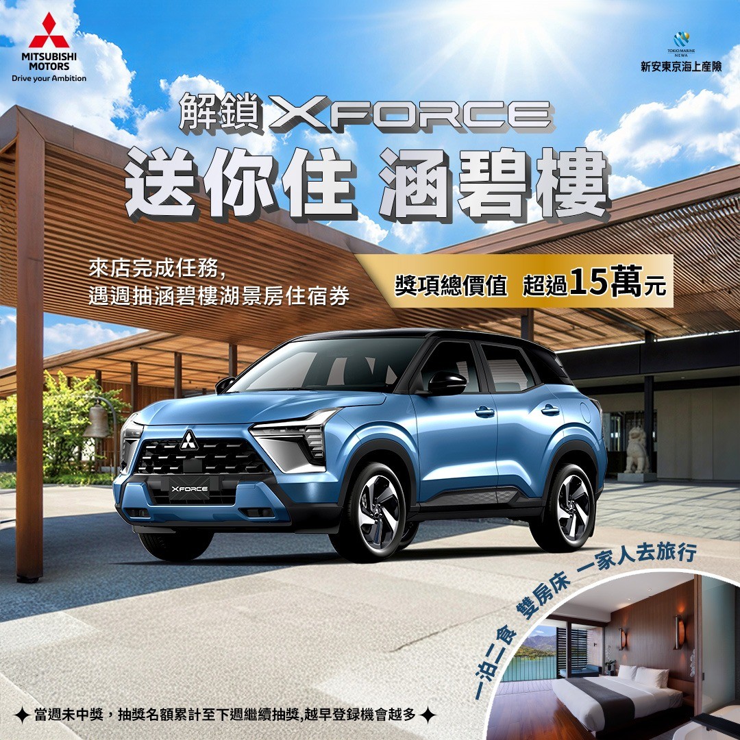 搭配進口配件上市,中華三菱自3/1起至3/31為止,於全台展示中心推出「解鎖 X 種無限可能」活動。消費者可透過中華三菱官方LINE進入線上互動遊戲(週週抽五星級住宿券活動: https://mitsubishi2026.webarfilter.com/ ),完成任務後至展示中心核銷參與抽獎。活動期間,週週抽出總價值逾15萬元之日月潭頂級飯店涵碧樓湖景客房住宿券,連續四週、每週抽出一位幸運得主,結果公布於中華三菱官方網站。完成試乘體驗亦可獲得限量黑沃咖啡禮盒,透過輕鬆的互動方式,讓賞車增加更多的有趣體驗,讓進店賞車的消費者,有機會將尊榮假期一併帶回家,活動不只強化消費者的進店體驗,更鼓勵實際坐進駕駛座,感受XFORCE的駕馭表現與車艙氛圍。