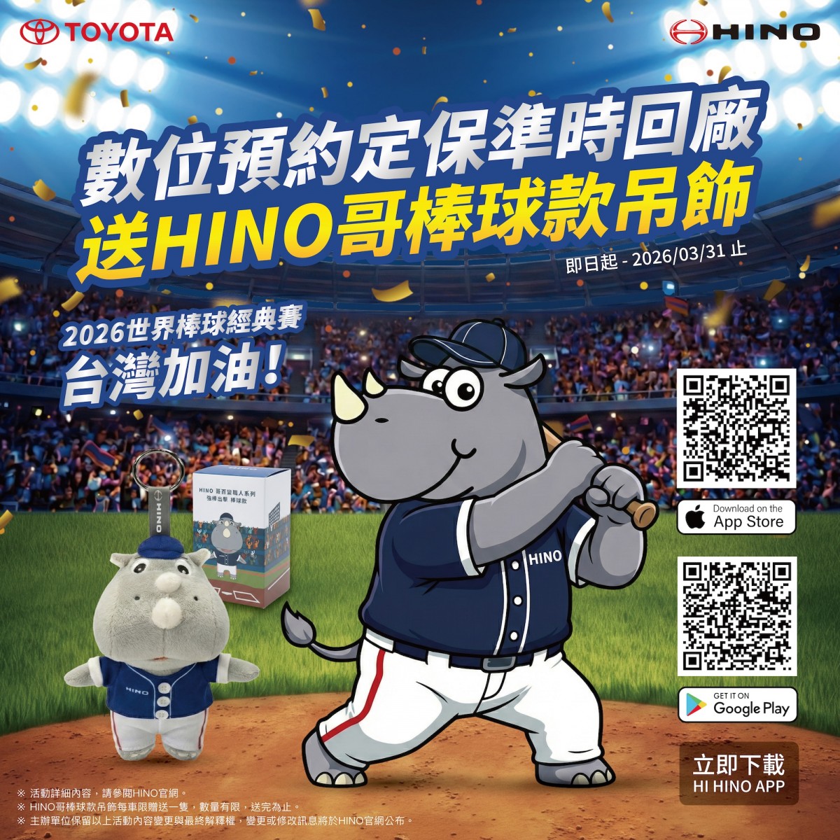 為了提升顧客預約回廠的便利性,今年HI HINO APP 功能全面升級,預約資訊更透明且操作更容易,2026年3月31日前使用數位預約定保準時回廠,就有機會將化身棒球選手的車主小幫手「HINO哥」帶回家!另外,今年嶄新的桃園旗艦據點、北新竹服務據點及各項智能服務等,都將帶給顧客煥然一新的驚喜體驗。