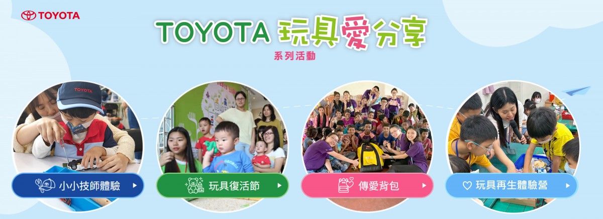 「TOYOTA玩具愛分享」活動自2016年推動至今,已成功幫助超過540噸玩具(約當於13萬棵樹年減碳量)踏上新生旅程。除了「TOYOTA玩具復活節」外,深受歡迎的「TOYOTA小小技師體驗」、「傳愛背包」,以及創新活動「玩具再生體驗營」等也將陸續舉辦,歡迎您一起加入我們,讓愛新生。