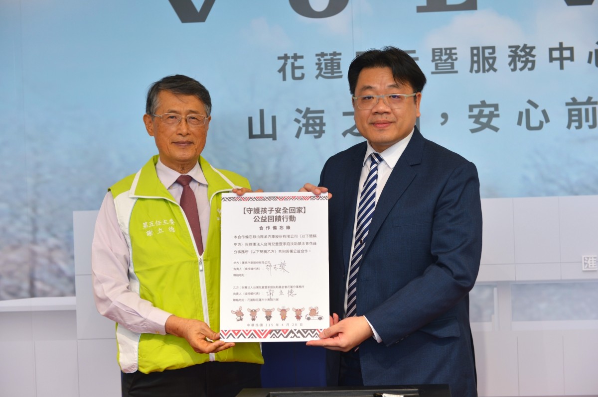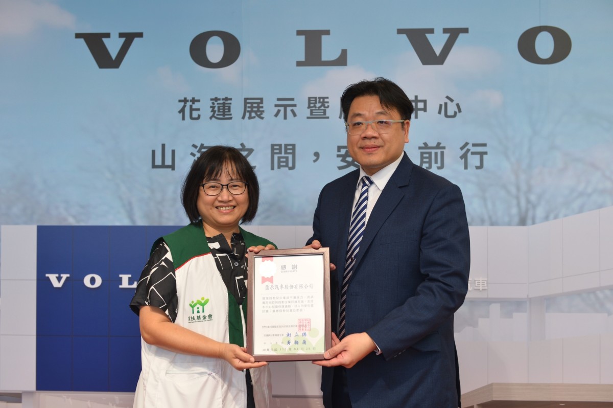 由花蓮家扶扶幼委員會主委謝立德先生(左)與 VOLVO 匯承汽車董事長茆志榮先生(右)