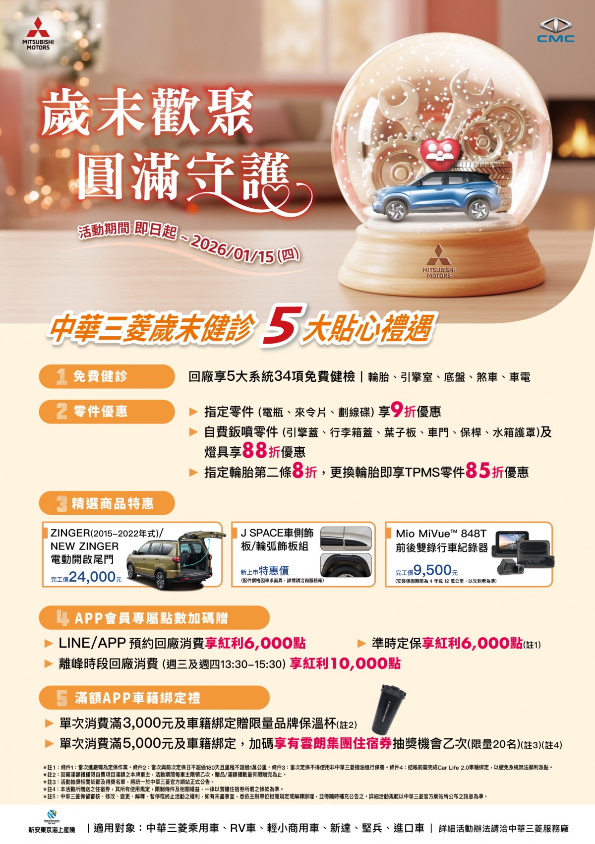 歲末將至,為讓廣大車主安心出遊,中華三菱宣佈即日起至2026年1月15日展開「車主回娘家」歲末健診活動。今年以「歲末歡聚,圓滿守護」為主題,不僅提供高達34項免費行車安全檢查,更祭出「五大貼心禮遇」,包含零件優惠、滿額好禮及豪華住宿券抽獎,體貼車主荷包,更全方位守護消費者的行車安全。