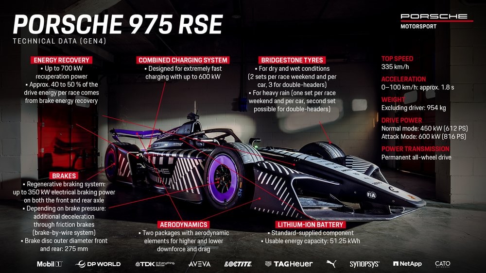 Porsche AG 正式發表全新 Formula E 賽車 975 RSE。這款單座賽車符合第四代 Formula E 賽車規範,並將自下個賽季開始參賽。全新 GEN4 賽車帶來電動賽車史上最大幅度的性能躍進,擁有 816 PS(600 kW)輸出功率、恆時四輪驅動、新款輪胎以及大幅提升的下壓力,使 Formula E 躋身全球最快單座賽車之列。