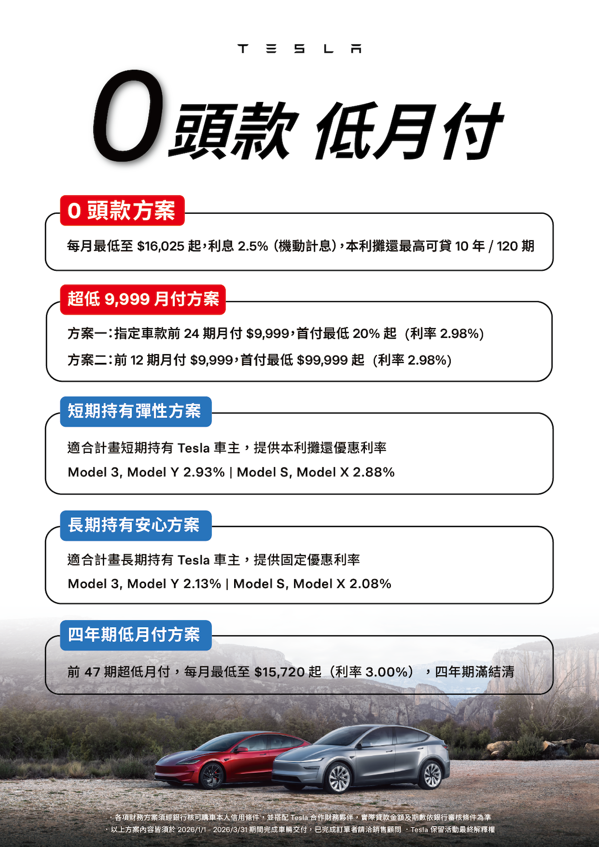 迎接全新年度,Tesla 推出新一季購車禮遇,Model 3 及 Model Y 雙車系現皆可零頭款入主,或使用月付 $9,999 方案輕鬆購車;Model S 及 Model X 兩款旗艦車系則可享既有車主 EAP 及 FSD 系統免費移轉服務。Tesla 全車系皆可同時搭配滿電出門套裝、車主推薦計劃, 與原廠中古車換購等方案,透過多元且靈活的購車選擇,Tesla 持續引領台灣電動車市,加速台灣電動車普及與能源轉型的進程。