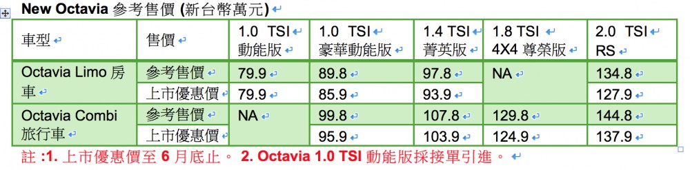在此次的規格配置方面,Octavia 房車擁有1.0 TSI 動能版、1.0 TSI豪華動能版、1.4 TSI菁英版;Octavia Combi旅行車則為1.0 TSI豪華動能版、1.4 TSI菁英版、1.8 TSI 4X4尊榮版各三種車款;兩者並再加入2.0 TSI RS車款。也就是說,無論是房車或是旅行車皆有四種不同的規格配備可供消費者選擇。