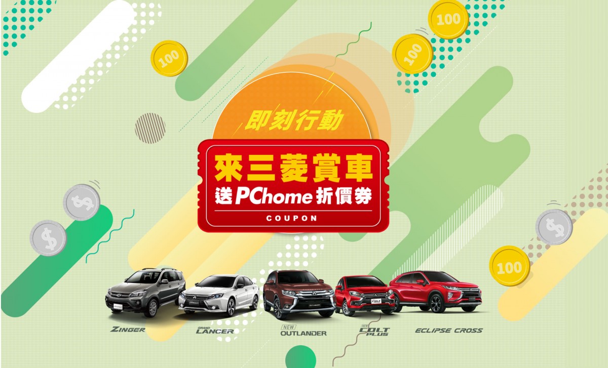 汽機車汰舊換新政策貨物稅減免 5 萬元即將於 2021 年 01 月 07 日屆滿,此政策成功帶動了民眾汰舊換新意願,到去年底為止,中華三菱已受理22,424輛車申請。由於今年為最後一年,中華三菱祭出新年度購車優惠,本月起至23日止,消費者至全台中華三菱展示中心賞車: COLT PLUS、GRAND LANCER、OUTLANDER、ZINGER與ECLIPSE CROSS,就送你PCHome限量折扣碼100元!全台數量2,000份,數量有限,送完為止!