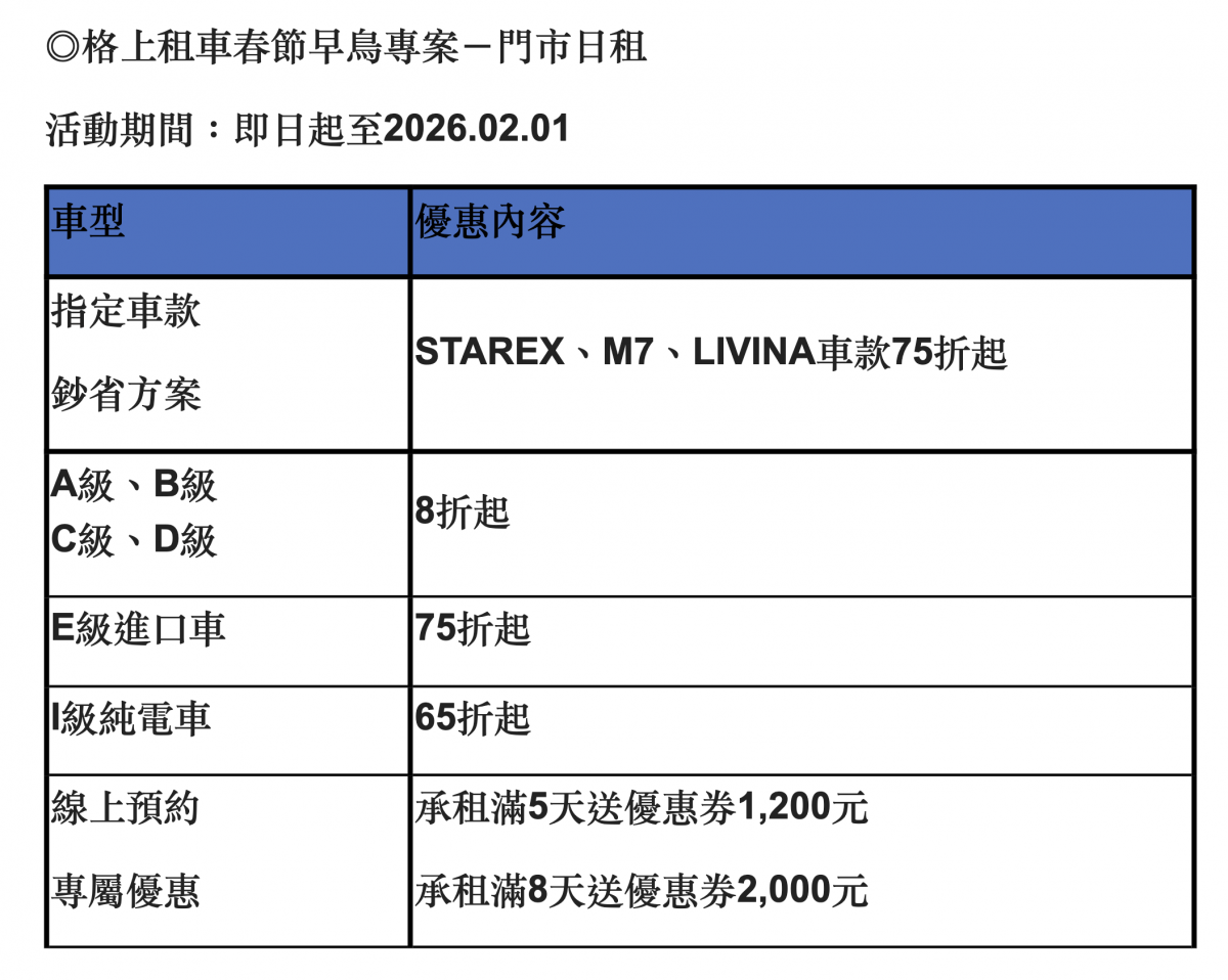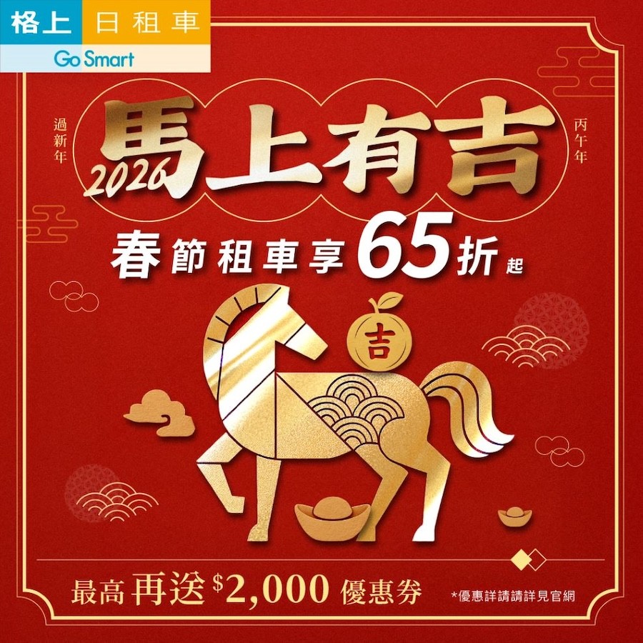 2026農曆春節連假將至,租車需求預期大幅增加。格上租車宣布春節「馬上有吉」早鳥專案正式啟動,即日起至2026年2月1日開放預訂,提供最低65折優惠,並加碼最高2,000元優惠券,鼓勵民眾提前規劃行程,分散假期租車高峰。若以線上方式預約訂車,春節期間單筆租滿5天加碼贈送1,200元優惠券,租滿8天更升級贈送2,000元優惠券,租期越長,優惠越高!