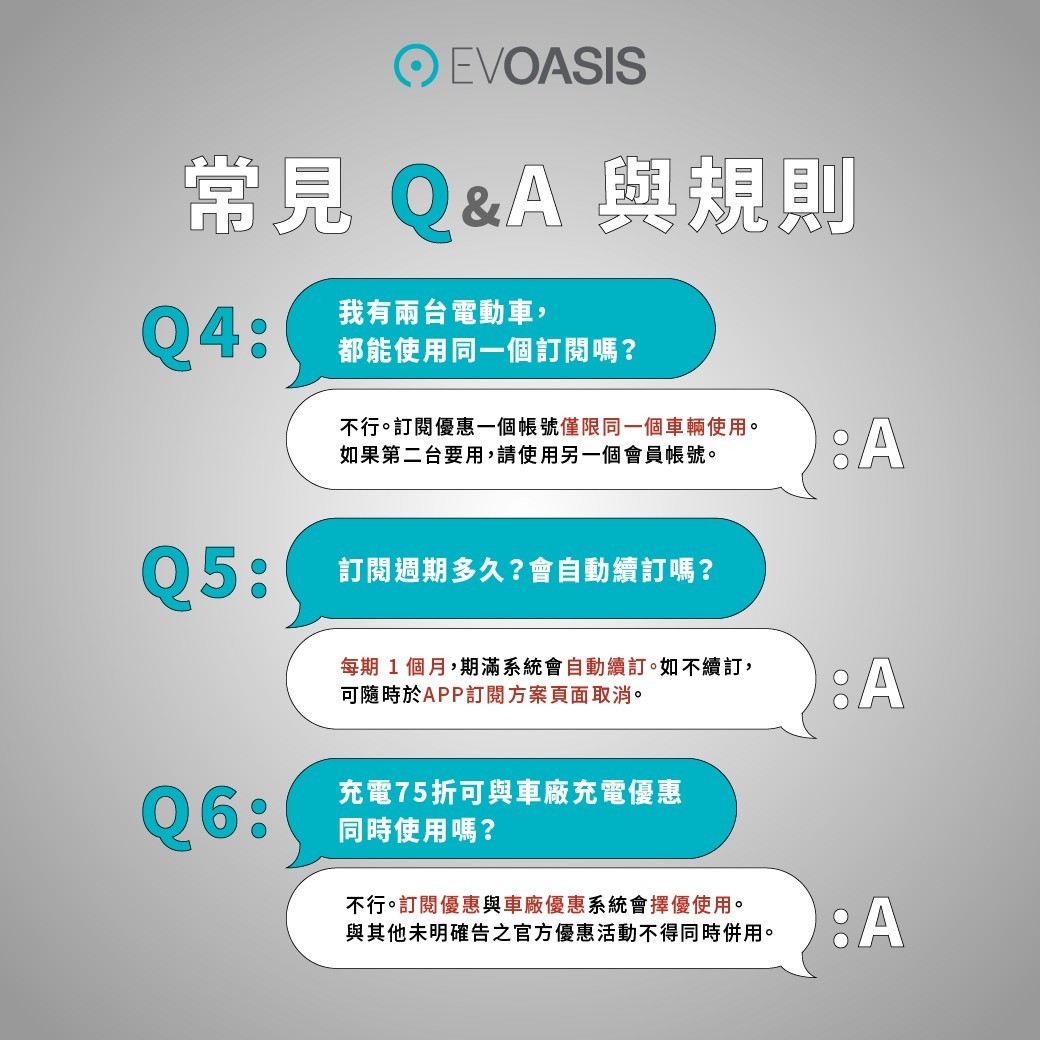 訂閱優惠不得與車廠充電優惠、新站上線優惠或其他未明確告知之官方活動重複使用,實際站點與費率以 EVOASIS APP 公告為準。