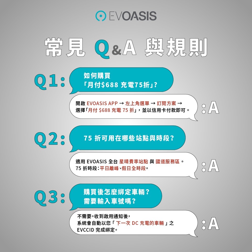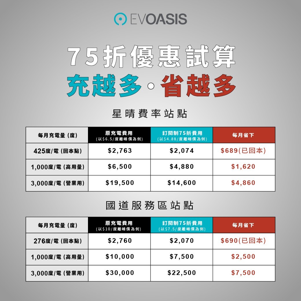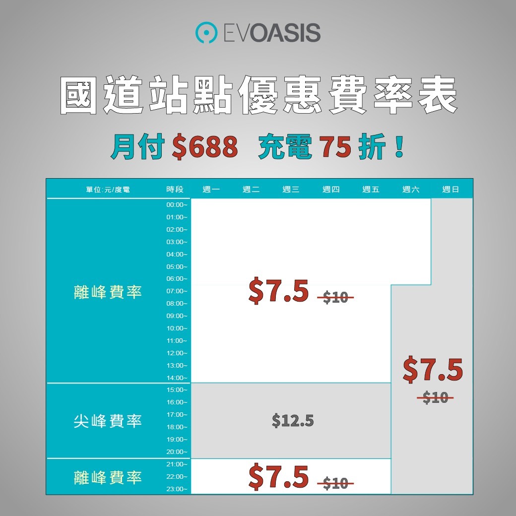 - 每月$688,享 EVOASIS 指定 DC 站 充電費率 75 折