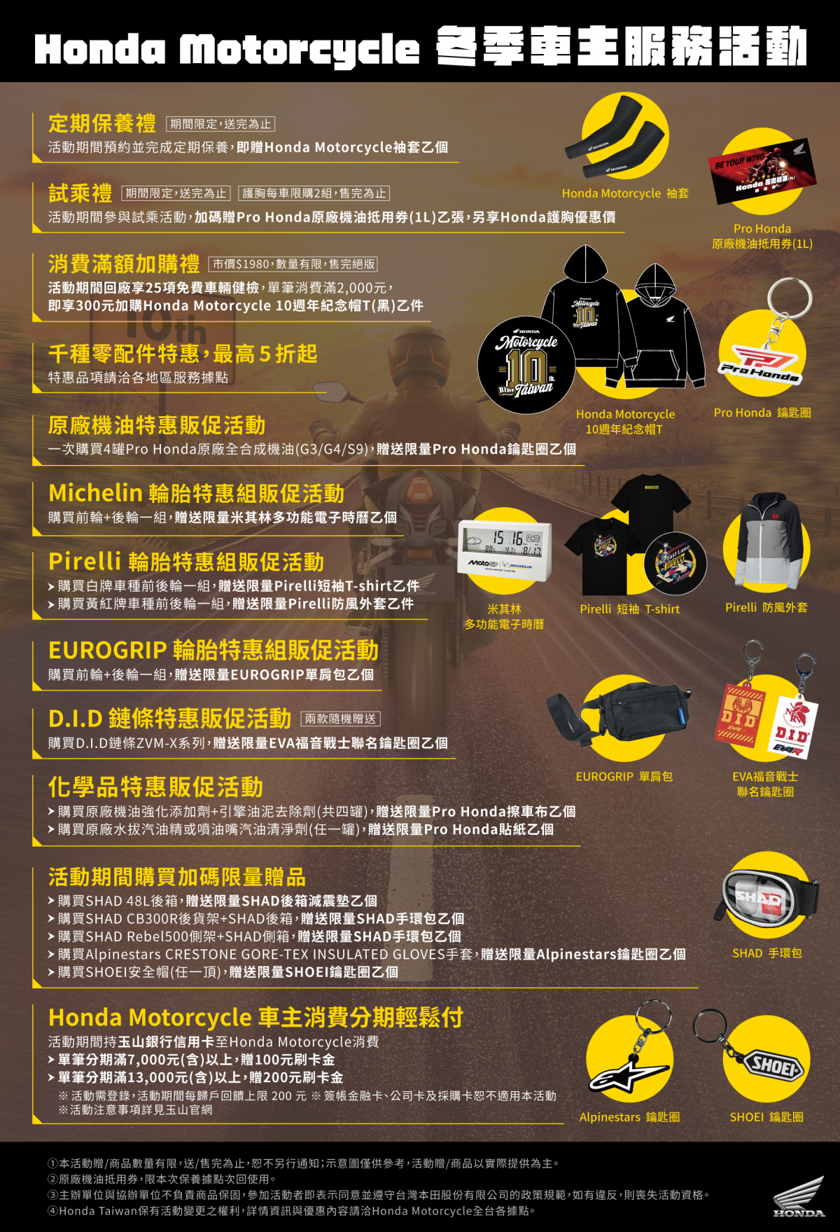 Honda Taiwan於2025/12/12至2026/2/14於Honda Motorcycle各經銷據點,舉辦「冬季車主服務活動」,活動期間回廠即可享25項免費車輛健檢,本次定期保養禮等專屬禮遇,千種指定零配件優惠活動同步開跑,邀請所有Honda Motorcycle車主回廠享受服務,一同邁向新旅程。