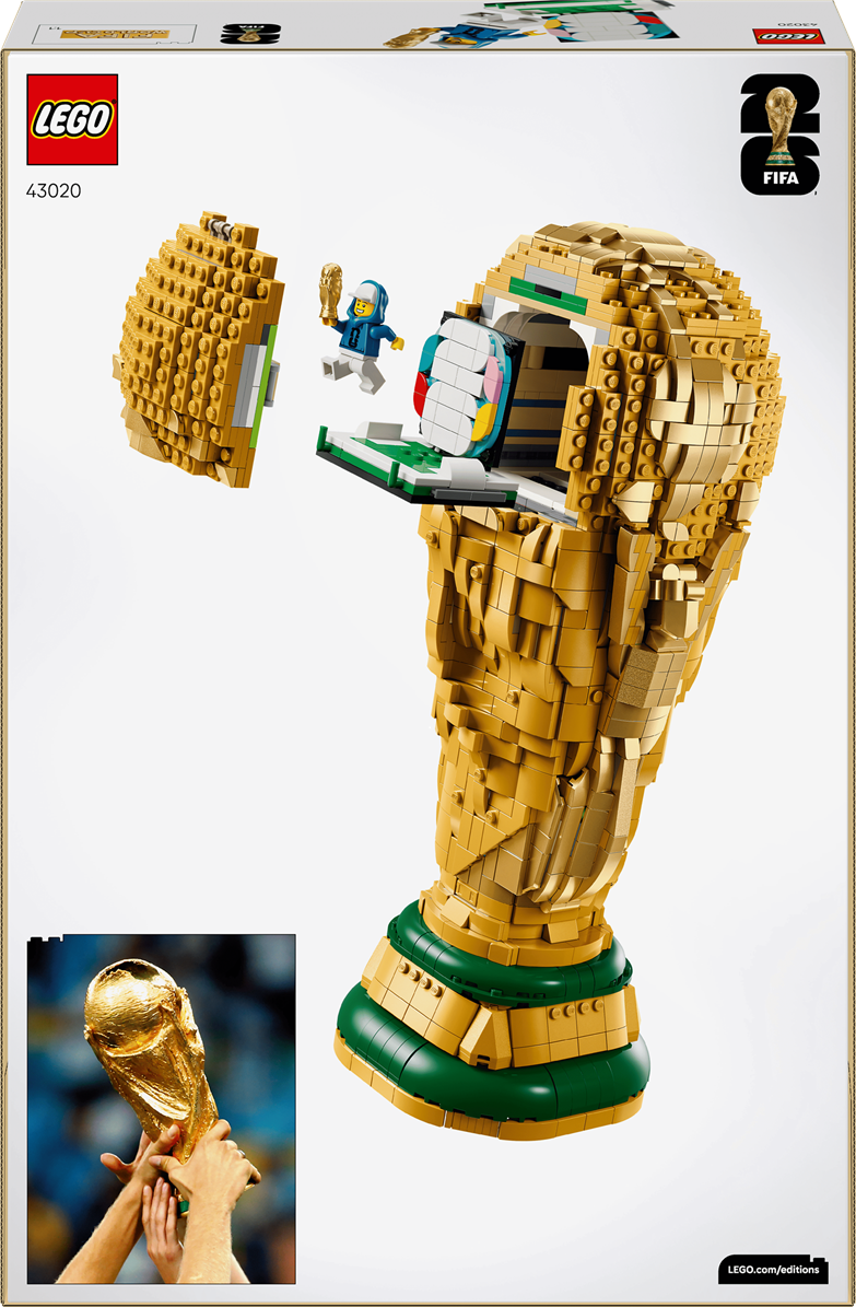 樂高®集團與 FIFA 世界盃 2026™ 首度合作,以 2,842 顆樂高®顆粒打造世界足球界最具象徵性的《FIFA 世界盃™ 官方獎盃》,完整重現金色獎盃的線條、質感與榮耀象徵。這款 1:1 比例的限量盒組將於 2026 年 3 月正式上市,並於即日起開放預購。獎盃頂部還藏有一個隱藏場景,可透過上方球體區域開啟,內含「2026 年世界盃專屬人偶」與迷你版世界盃獎盃。讓球迷們能在拼砌過程中感受揭開彩蛋般的驚喜。底座更印有自1974年至今歷屆奪冠隊伍名單,此盒組主要以兩種金色顆粒打造,也是樂高首次使用如此大量的金色零件,是結合工藝、紀念性與樂趣的重量級作品。