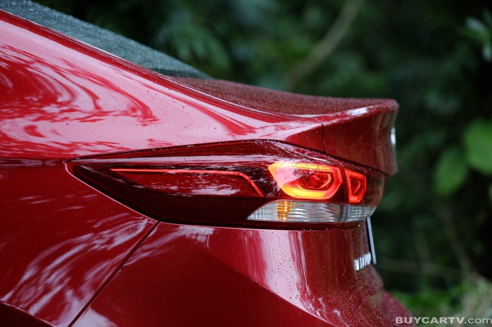在後部造型部分,可以看到從B柱開始向後傾洩而下的車頂,和側窗逐漸向上勾起的線條,在C柱前結合成類似三角狀的窗框收尾,這樣的設計在前一代車款上就可以看見,也是塑造Elantra跑風十足的招牌印記。至於車尾的設計個人認為是Elantra此次視覺上最為精采的部分,尾廂蓋鈑件刻意做出的鴨尾角度,和LED尾燈組搭配起來,確實營造出房車領域中較為突出的運動形象。至於在圈胎配置上,2.0升汽油車款一律採用205/55 R16的規格,並採用了鈦銀色的雙色輪圈,基本上是屬於兼顧操控與乘坐舒適性的設定。