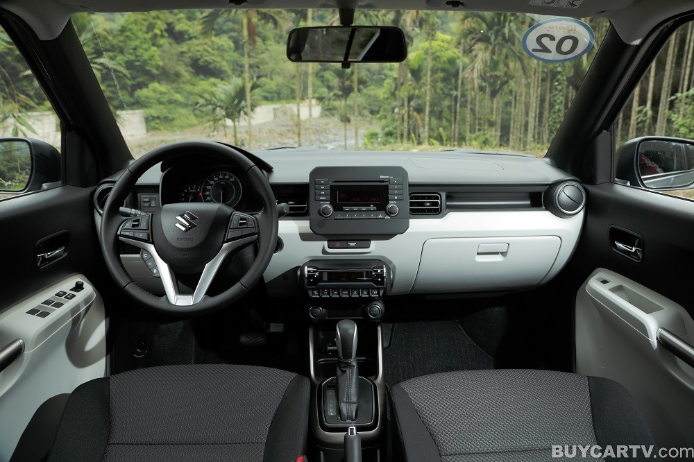 進入到Ignis的車艙,上黑下米白的色調搭配是讓人第一視覺產生好感的鋪陳,先不論其耐髒性,這樣的設計確實減少了很多小車常見的壓迫感,另外雖然以此車的定位,內裝塑料當然難免還是採用硬塑膠材質,但無論是表面壓花的質感或是組裝品質都有中上等級的水準,而且如同外觀,依舊可以發現許多小小的設計巧思,例如左右兩邊圓形空調出風口周圍的纇碳纖維花紋飾板、如筒形設計的恆溫空調操作介面,以及同樣有著三條線印記、採用烤漆材質的排檔鞍座,而且這塊烤漆材質,還會因為車身不同的色調而有所對應搭配。儀錶板採用的傳統類比指針圓錶,右邊則有一個單色的行車資訊顯示幕,整體而言雖不炫目,但在盤面藍色印花的點綴下,看起來也不失活潑。另外免鑰匙開關車門、引擎啟閉按鈕及定速巡航系統都是標準配備。