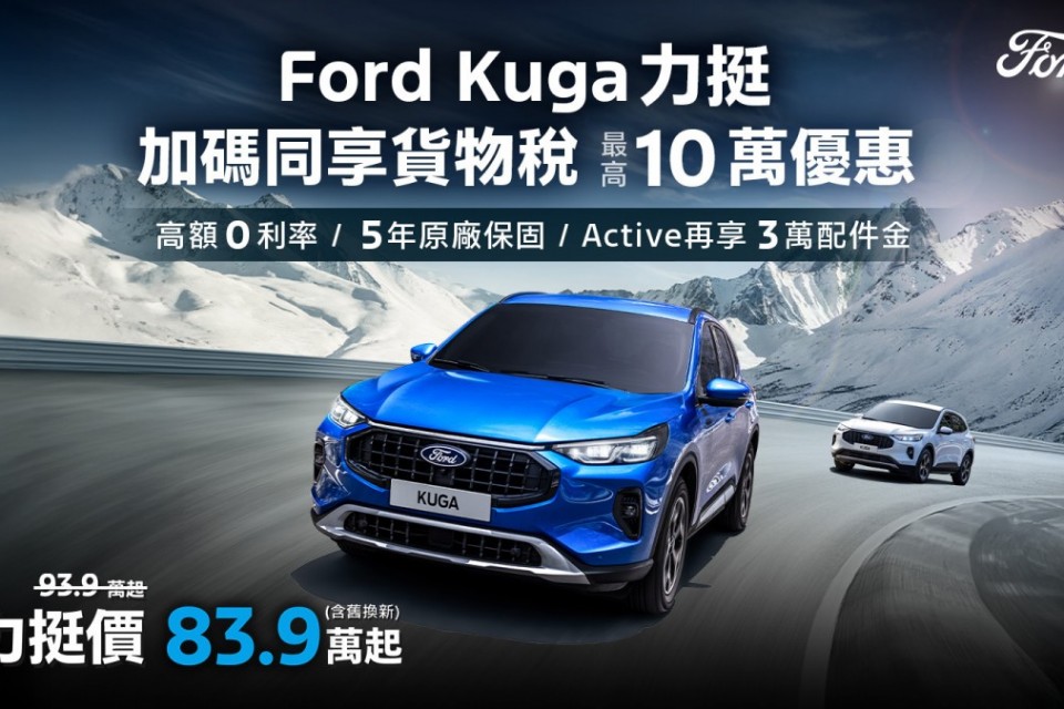 響應貨物稅減徵政策,Ford Kuga力挺價83.9萬起,再享高額零利率與原廠保固! 好試家倍!Ford指定車款享貨物稅減徵最高10萬元,試駕再送全家禮物卡