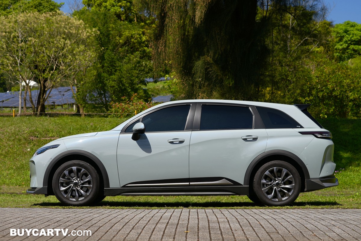車側以修長且流暢的車身比例展現大型純電休旅的穩重氣勢。厚實的輪拱與高腰線營造出沉穩且具力量感的視覺效果,車尾則以簡潔的橫向線條與整合式尾燈設計收尾,呈現科技與實用兼具的風格。